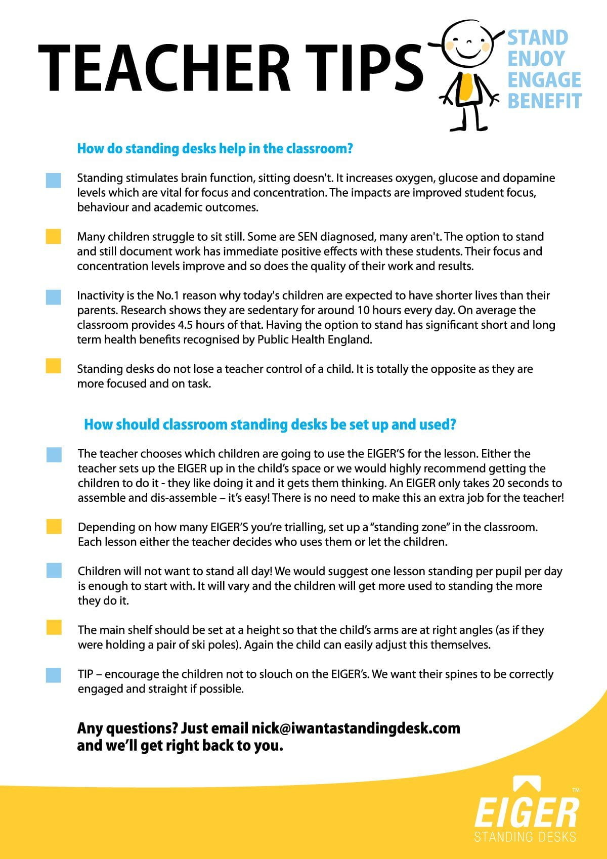 To help busy teachers understand the why’s and how’s of using a classroom standing desk for their children/students we created a valuable “Teacher Tips” resource. It’s here…
